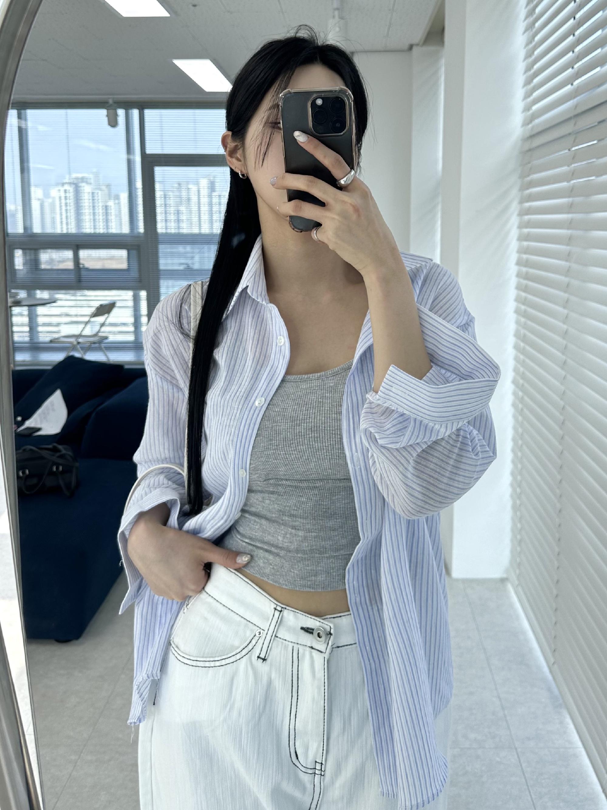 [여리핏/살안타템✨] 올데이 시스루 오버핏 스트라이프 셔츠