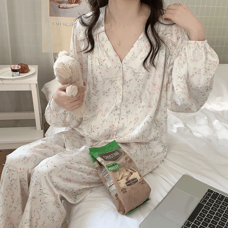 노카라 플라워 실크 잠옷 여성 긴팔 긴바지 빅사이즈 봄 무지 공주 파자마 투피스 세트