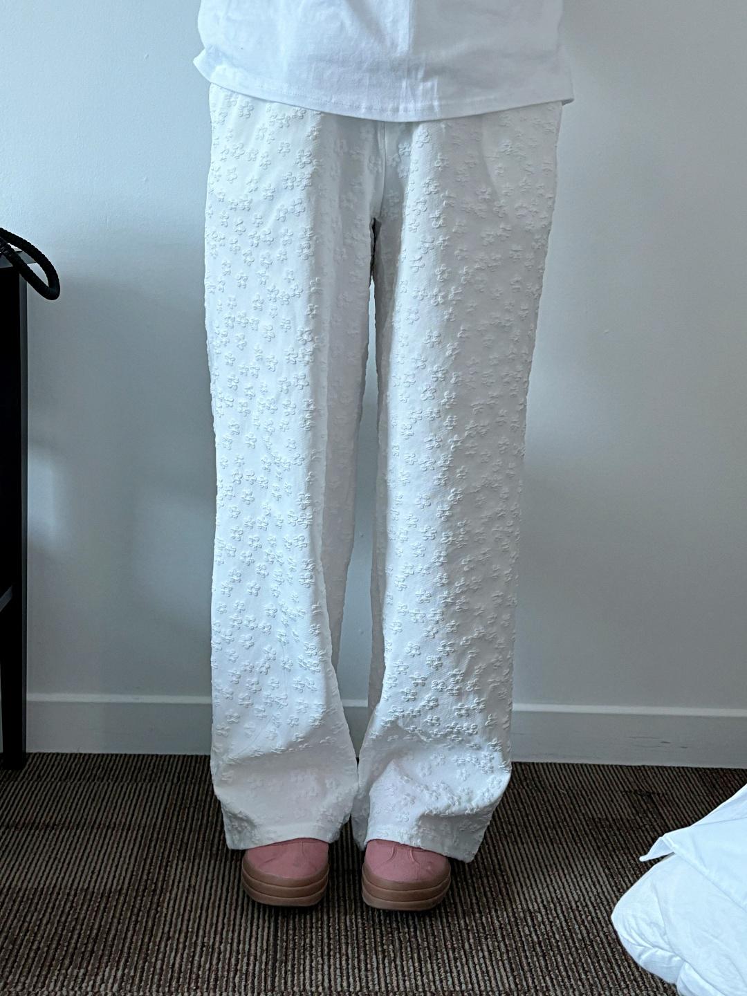 [유사품주의💥당일출고보장] 엠보 리본 밴딩 스트링 플라워 와이드핏 엠보싱 와이드팬츠