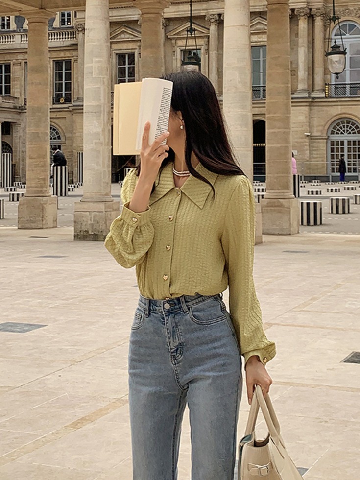 [봄데일리템❀/체형보완] [44-120] 러쥬비드 링클 스판 하트 버튼 오픈카라 블라우스( 신상-봄-가을-데일리룩-데이트룩-출근룩-오피스룩-러블리룩-캠퍼스룩-모던룩-빅사이즈-120사이즈-자체제작-여리핏 )