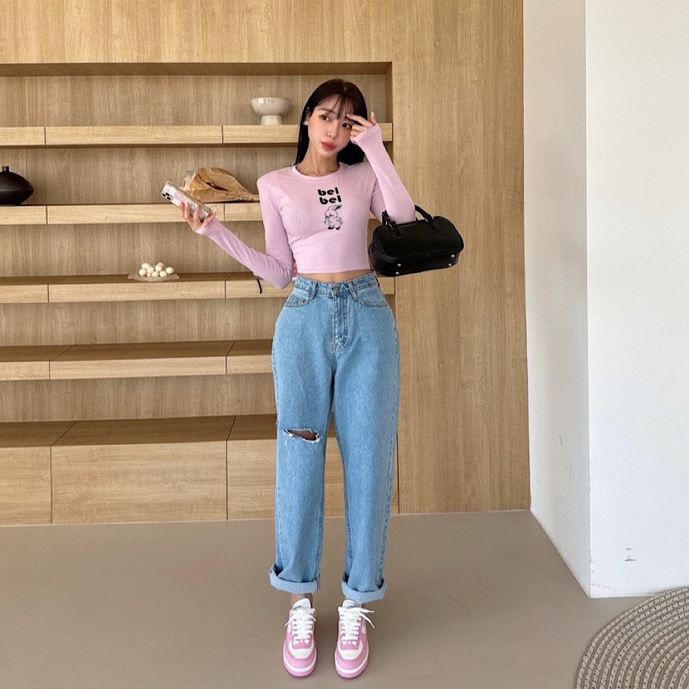 ( SALE ) 여성 여자 데일리룩 하이웨스트 배기 일자 찢어진 청바지 (S-L)