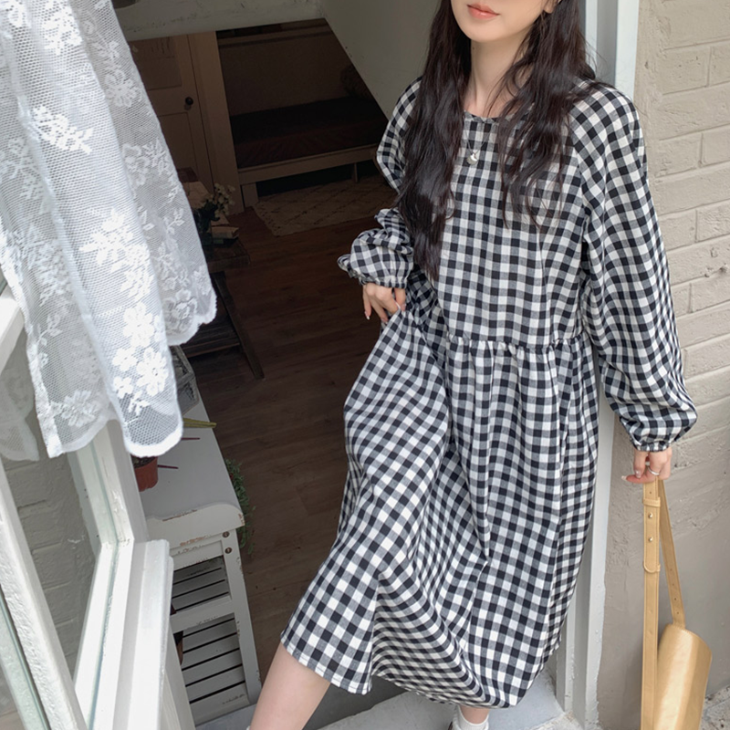여성 봄 여름 긴팔 롱 원피스 루즈핏 체크 편한 데일리