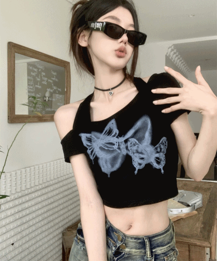 [키치룩!/유니크!] 배색 버터플라이 홀터넥 오프숄더 크롭 반팔 티셔츠