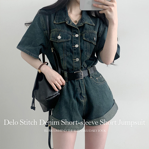 [y2k/벨트SET/청청/키작년추천] 델로 스티치 데님 반팔 숏 점프수트