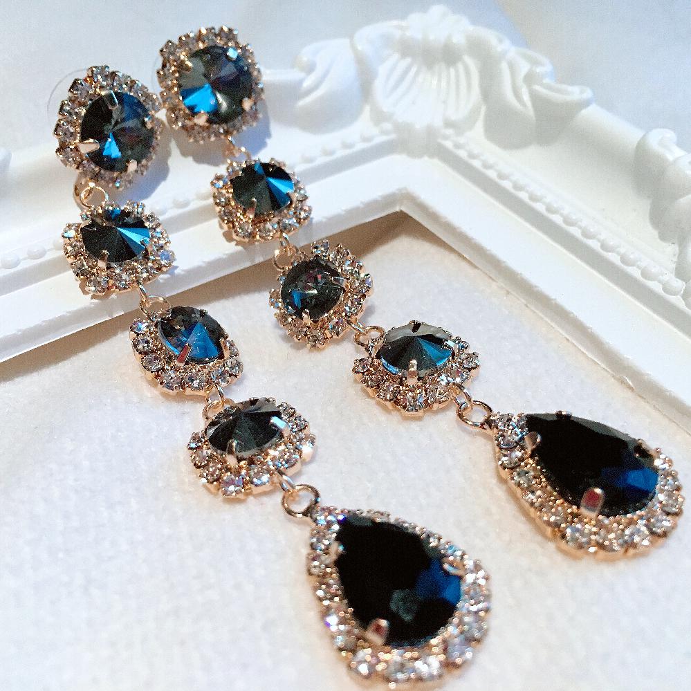 [당일배송] 032 고급스러운 블랙 해마 크리스탈 큐빅 볼드 물방울 롱 드롭 귀걸이