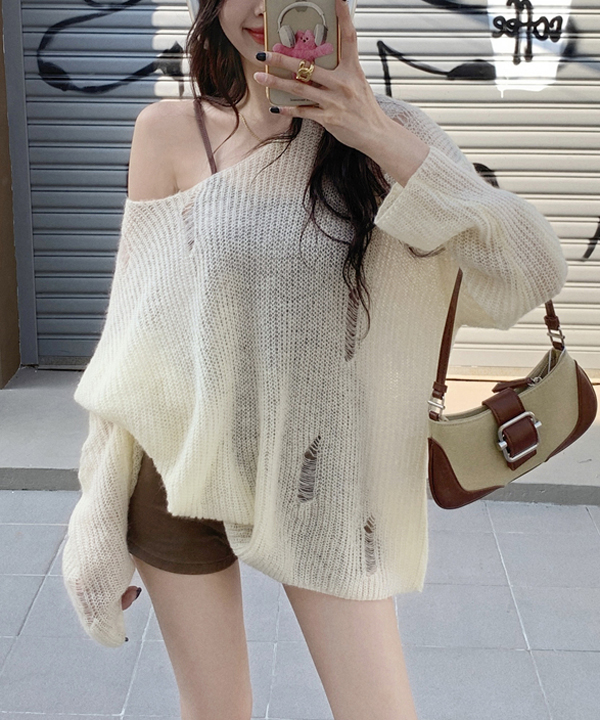 [디스트로이드 오버핏 시스루 니트] 보트넥 로우숄더 루즈핏 하프 얇은니트 풀오버 힙한 트렌디 봄 여름 캐주얼 데일리룩 살안타템