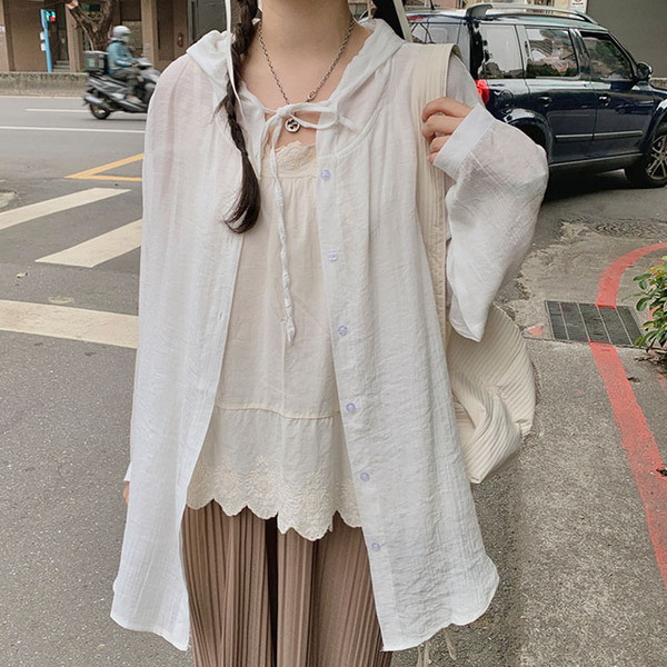 [4color] 후들후들 시스루 면 간절기 후드 셔츠 버튼 플리츠 커버업 레이어드 롱 남방 살안타템