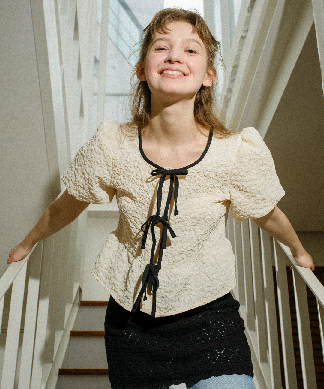 플라워 자카드 리본 퍼프 블라우스 (2c)