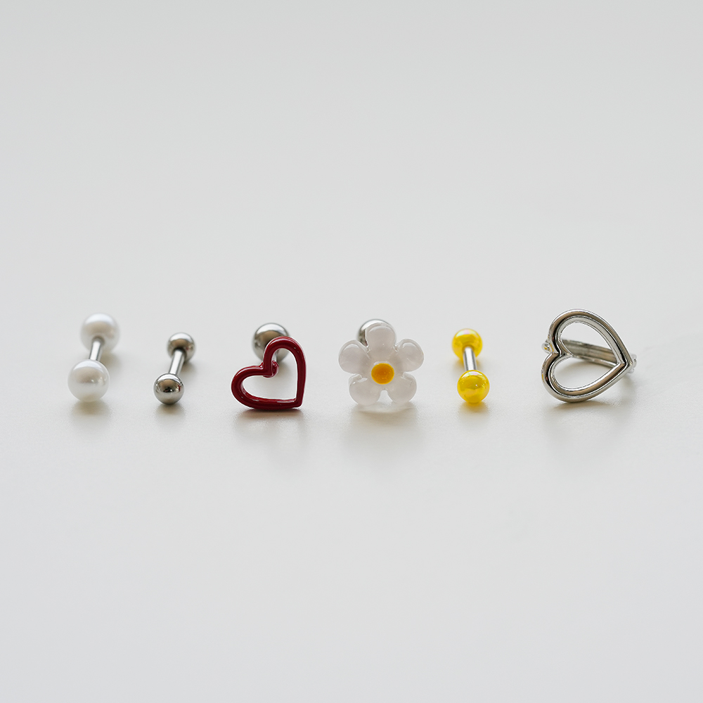 💕총 6개 세트💕 레드 하트 화이트 꽃 원터치 진주 기본 볼 옐로우 러블리 피어싱 세트