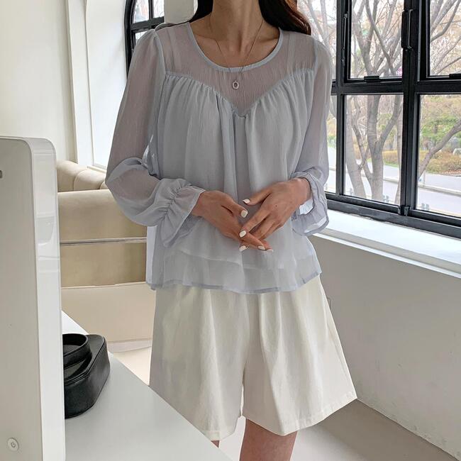 코로소 라운드넥 하트절개 플레어 쉬폰 블라우스