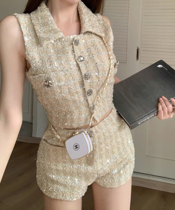 무료배송 [코디세트 베스트+팬츠] 골드펄 샤이닝 트위드 쇼츠투피스 (골드)
