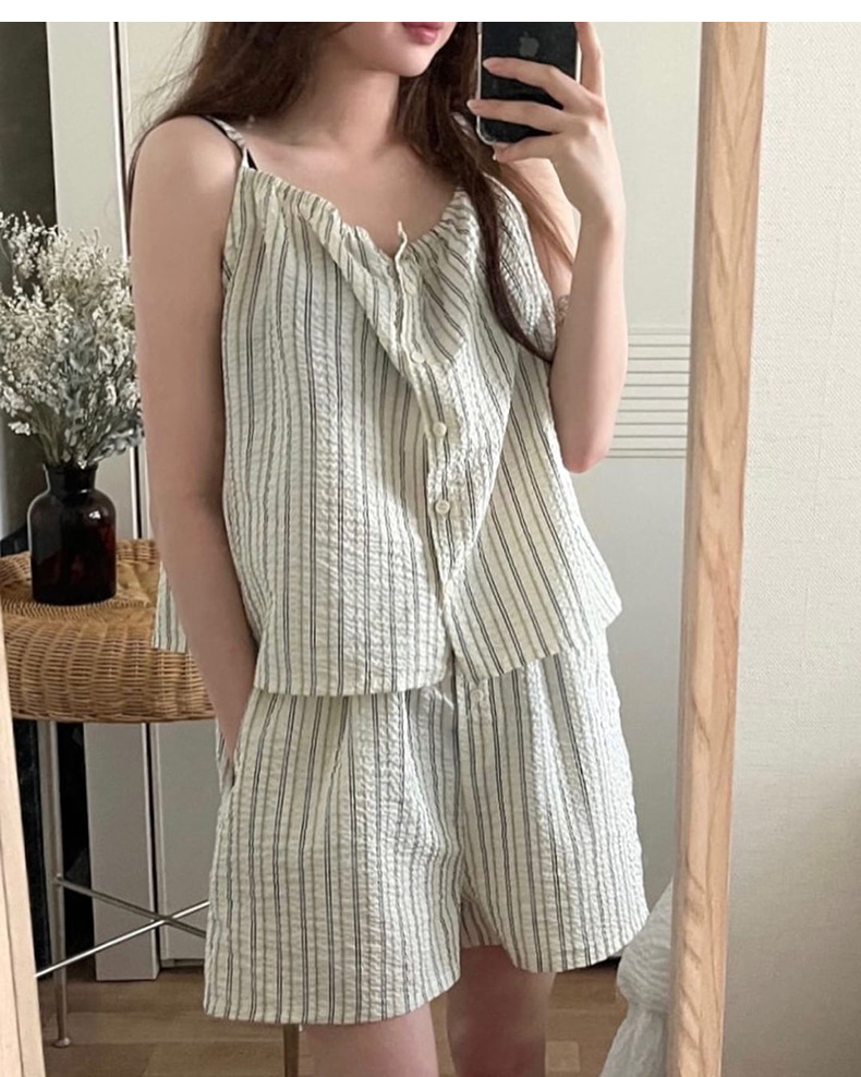 [~4XL] SET 린넨 스트라이프 통기성 얇은 나시 반바지 홈웨어 세트