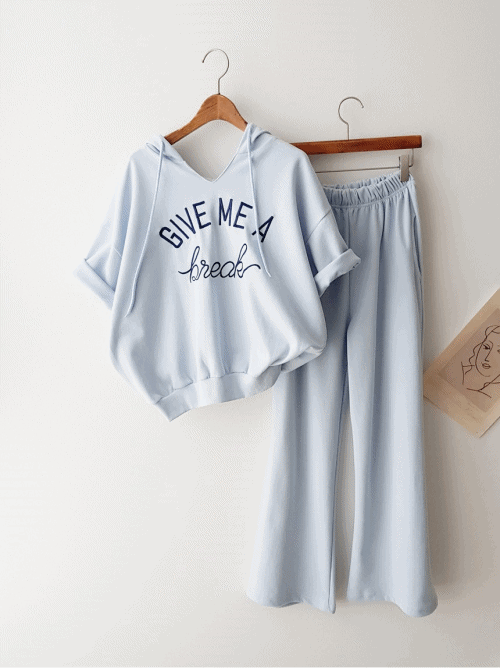 [유니크/꾸안꾸] GIVE ME 자수 레터링 브이넥 반팔 후드티셔츠 후드맨투맨 밴딩 일자바지 와이드팬츠 투피스 봄 여름 데일리세트 체육복 운동복 여행룩 수학여행 추리닝세트