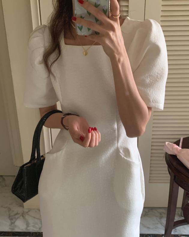 포켓 셀프웨딩 스퀘어넥 롱 드레스