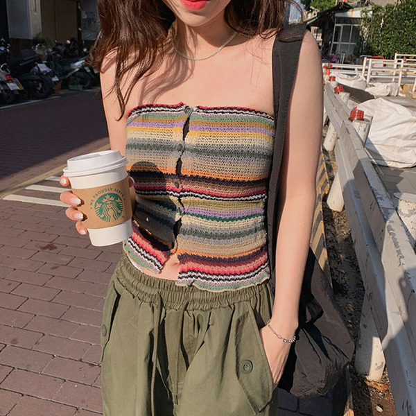 [2color🌈] 레인보우 버튼 튜브 니트 탱크탑 레이어드 오프숄더 니트 스트라이프 단가라 여름니트 탑 휴양지룩 페스티벌룩