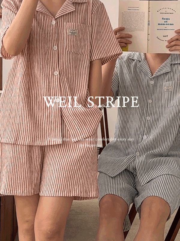 ⚡BEST스판✨ H.made✔ 웨일 스트라이프 잠옷 커플 반팔 여름 파자마 세트 2color 직진배송