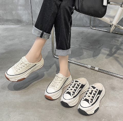 [4cm통굽] 키높이 뮬 스니커즈 배색 운동화 봄 여름 캐주얼 스니커즈뮬 통굽슈즈 뮬운동화 뮬슬리퍼 슬리퍼뮬 슬리퍼운동화 캔버스뮬 단화 캐주얼룩 데일리룩 개강룩 벚꽃룩