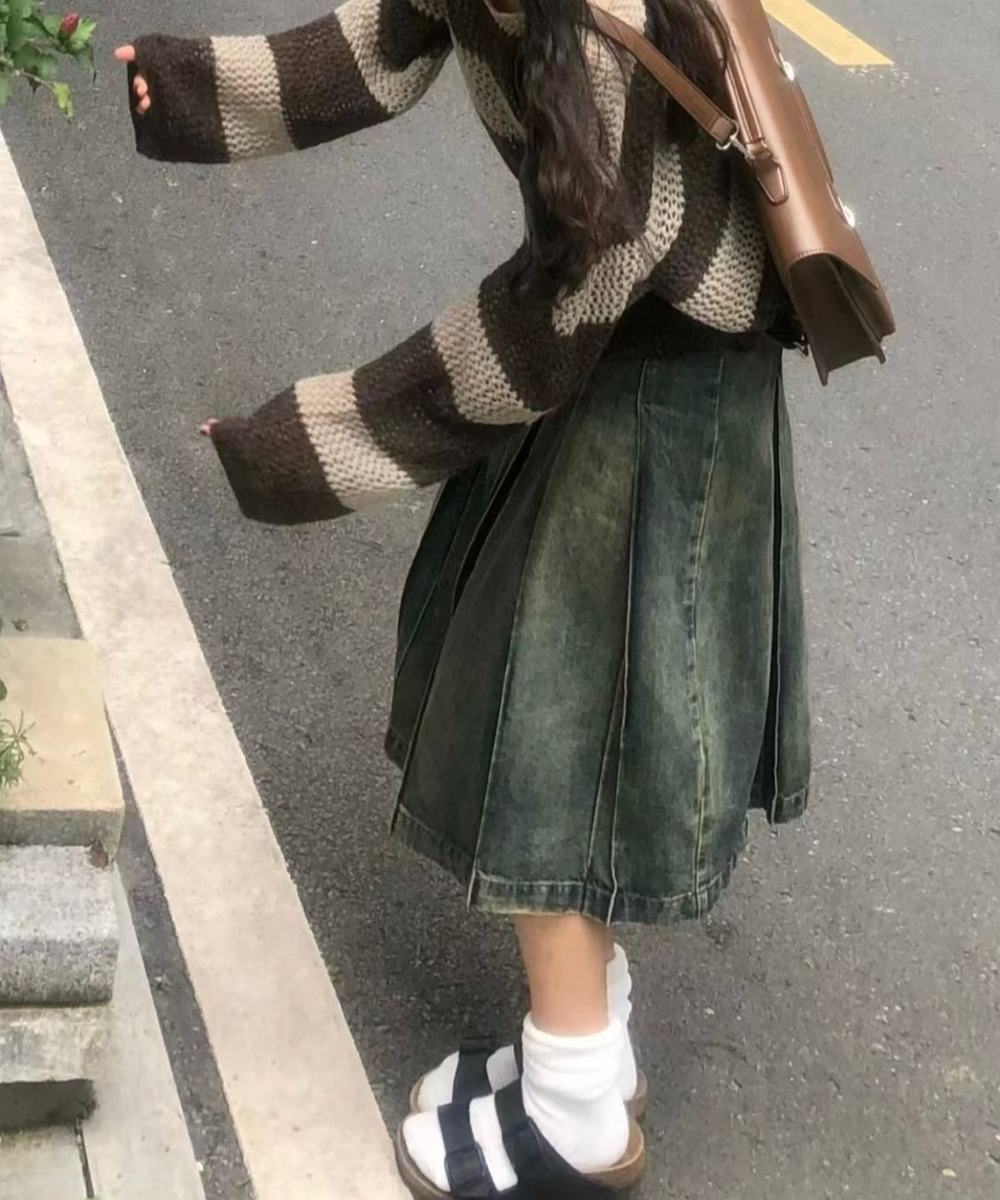 미디 기장 빈티지 워싱 플리츠 데님 스커트
