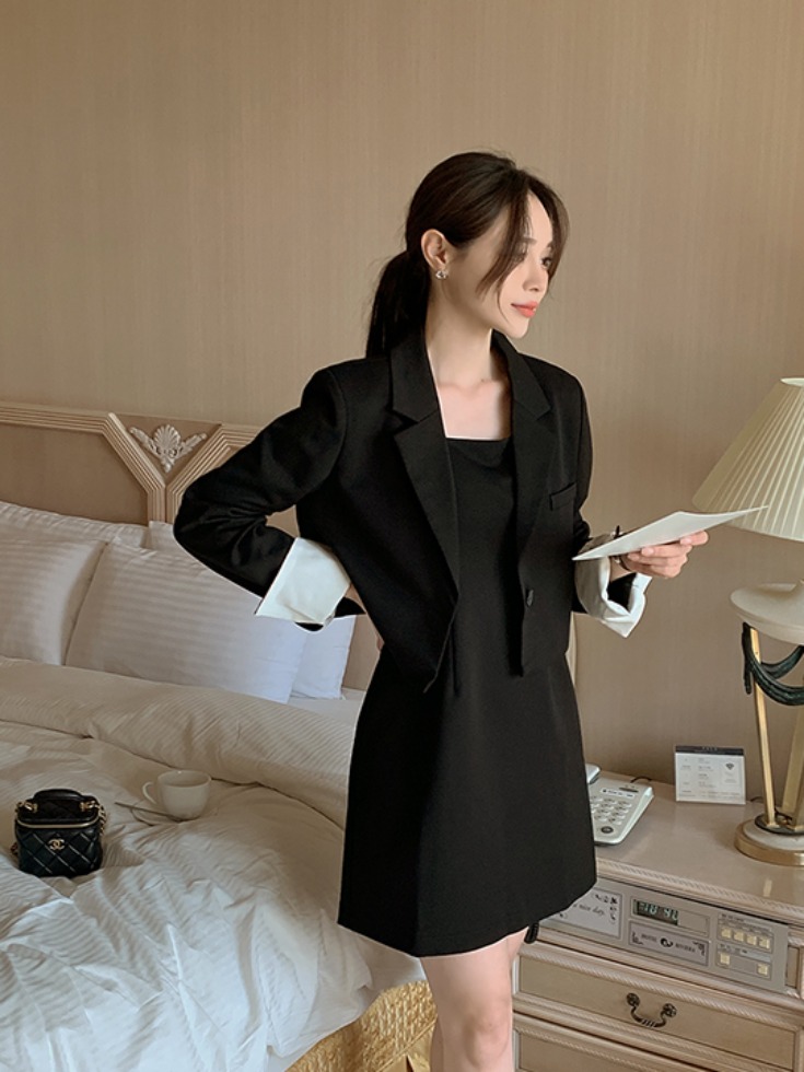 [44-120] 드테블론 크롭 자켓 뷔스티에 미니 원피스 세트 (끈조절) ( 봄-가을-여름-데일리룩-캠퍼스룩-출근룩-오피스룩-하객룩-격식룩-빅사이즈-120사이즈-자체제작-세련된-단정한-단아한-통통녀-여름하객룩)