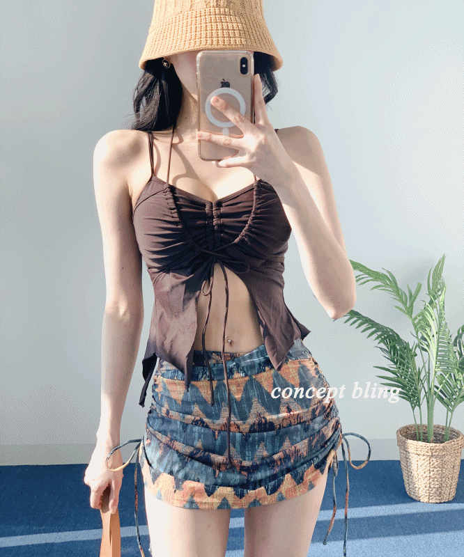 히피 2pcs 비키니 홀터넥 리본 뱃살커버 스커트 포함 스트링 수영복 컨셉블링