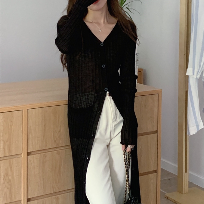 브이넥 골지라인 세미 시스루 니트 롱 가디건 AG114894