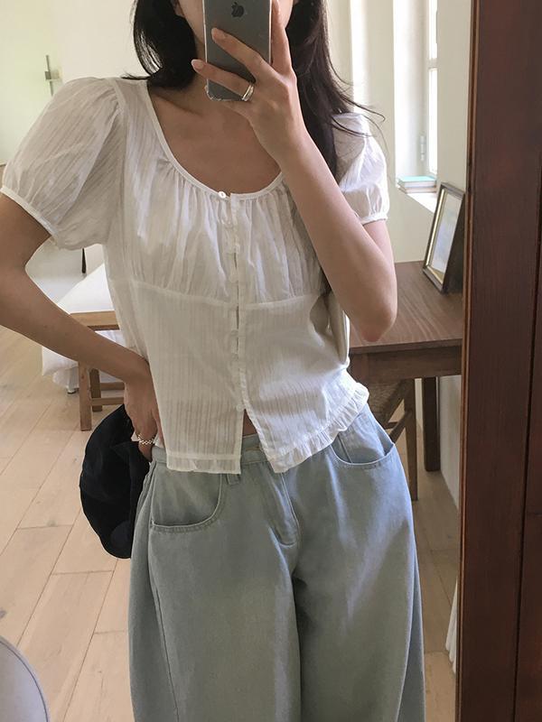 [여리핏]리에 셔링 크롭 겨울 블라우스 (긴팔/반팔ver)(3color)