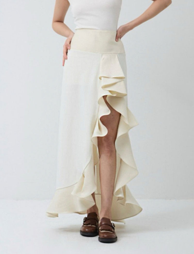 고퀄리티 슬릿 프릴 맥시 실크 스커트 (크림 블랙)
