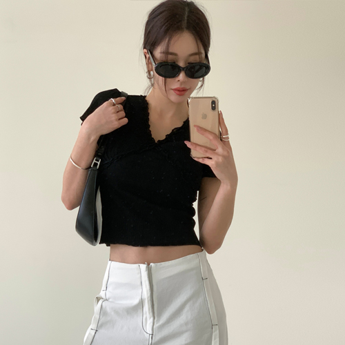 [😘레이스 러빙유 브이넥 티셔츠 ] 귀여운 레이스 넥라인과 뷔에스티 디자인으로 사랑스러운 신축성좋은 골지티셔츠