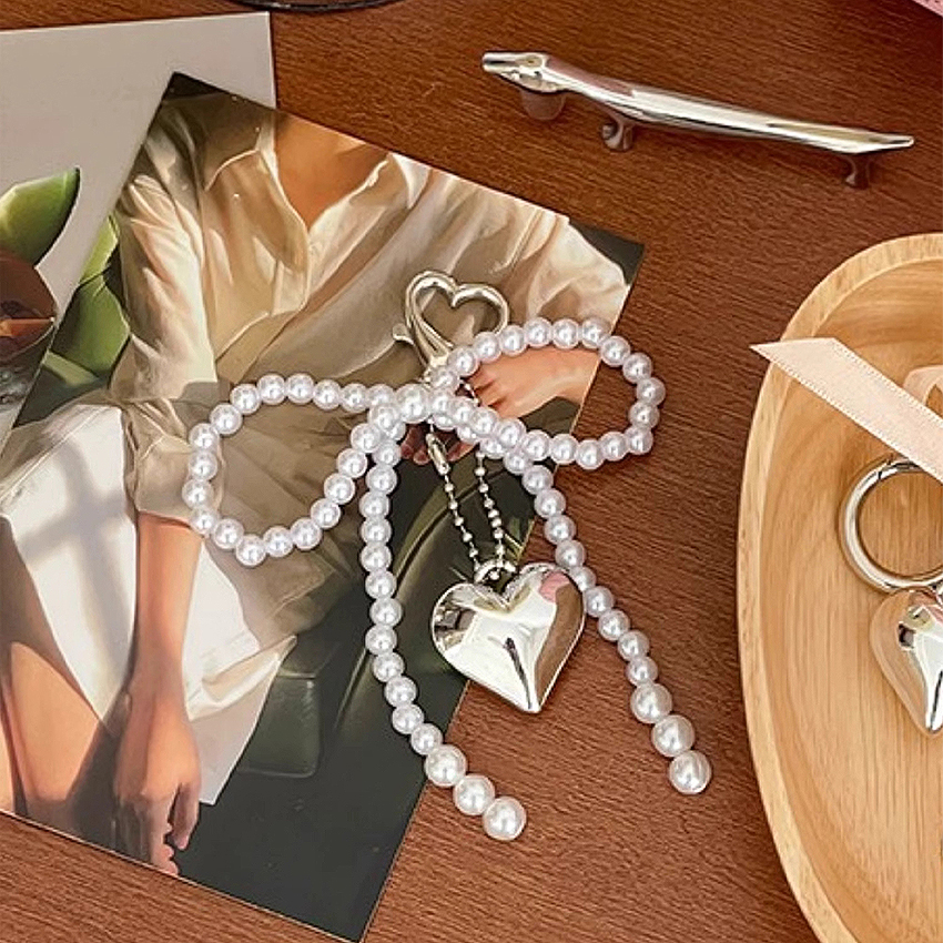 [당발/특가세일] 진주 빅 리본 실버 하트 키링 가방 핸드폰 열쇠 발레코어 고리 SD002