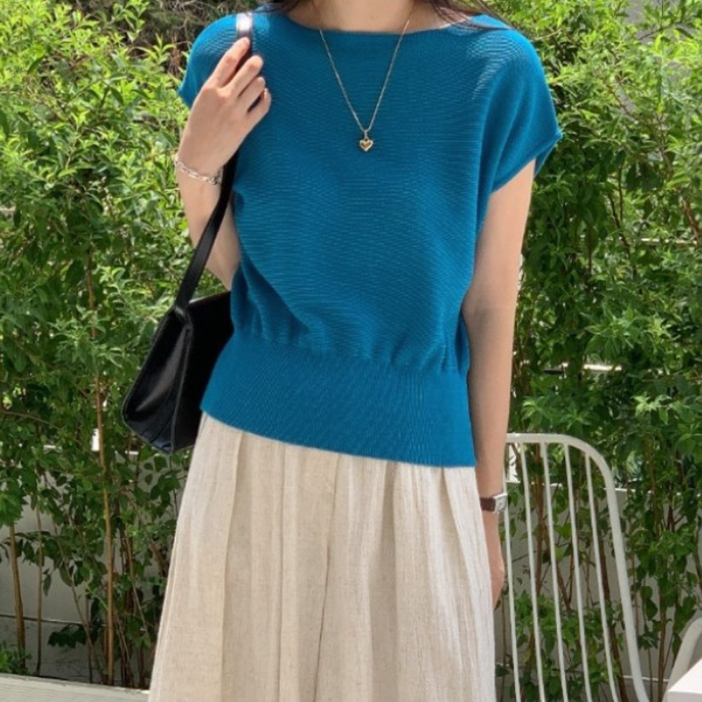여자 봄 로즈 블루 보트넥 나그랑 캡소매 반팔 니트