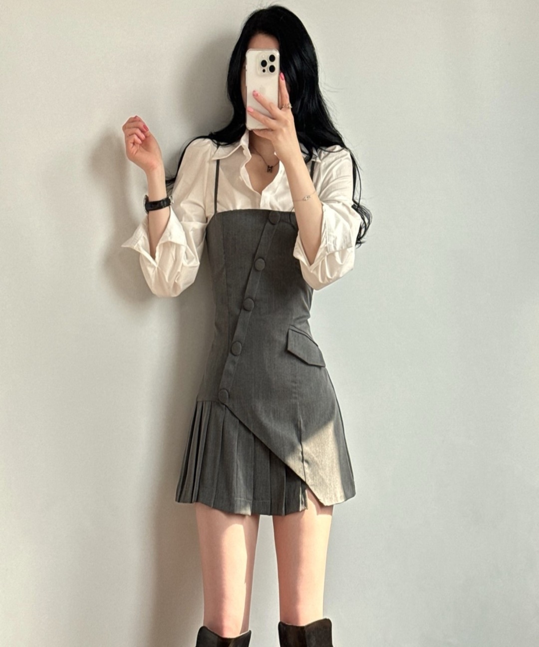 [하객룩/투피스세트] 봄 무지 나미 긴팔 셔츠 뷔스티에 미니 원피스 세트 투피스