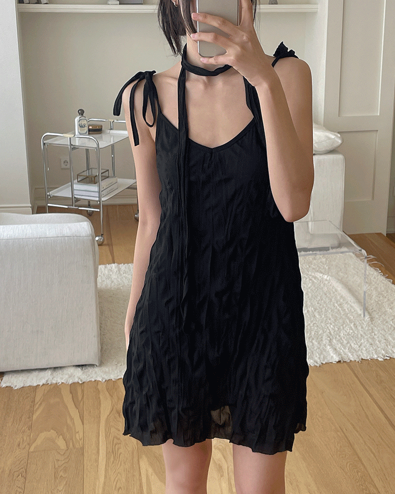 [머플러세트]코코 링클 주름 시스루 끈나시 미니원피스(3color)
