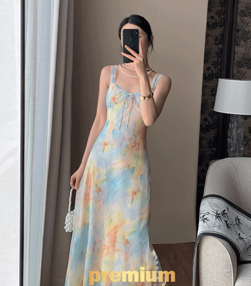 ★보위 끈 나시 민소매 플라워 패턴 롱 원피스★ 프리미엄 레인보우 A라인 리본 타이 롱 원피스 하객룩 스몰웨딩 셀프웨딩 스튜디오 촬영 여행 휴양지 휴가지 비치 해변