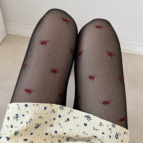 [장미 망사 스타킹] 시스루 망사 로즈 자수 스타킹 / 패턴 꽃 자수 레이스 비치는 스타킹 (블랙 퍼플)