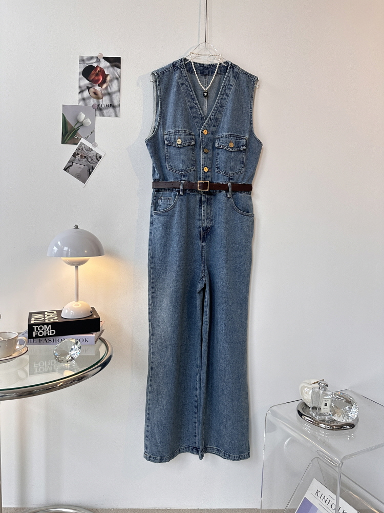 브이넥 나시 민소매 와이드 벨트 데님 점프수트 (2C)