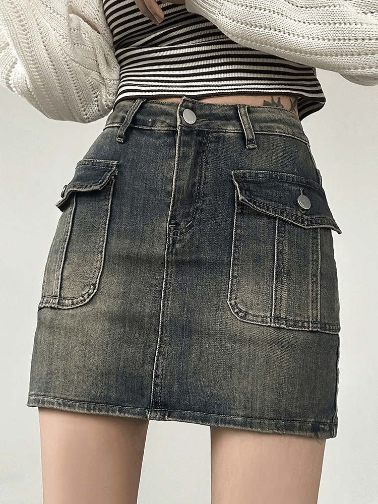 당출🚀[속바지/S사이즈] 빈티지 구제 워싱 절개라인 카고 포켓 데님 스커트