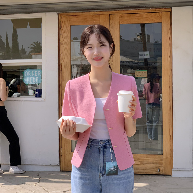1000장 돌파✨ [트위드/링클프리/브랜드퀄리티/하객룩] 프레니 골드 스틱 브이넥 트위드 반팔 노카라 자켓 데일리룩/데이트룩/소개팅룩/출근룩 썸머 나들이룩 트위드자켓 여름 jk2834