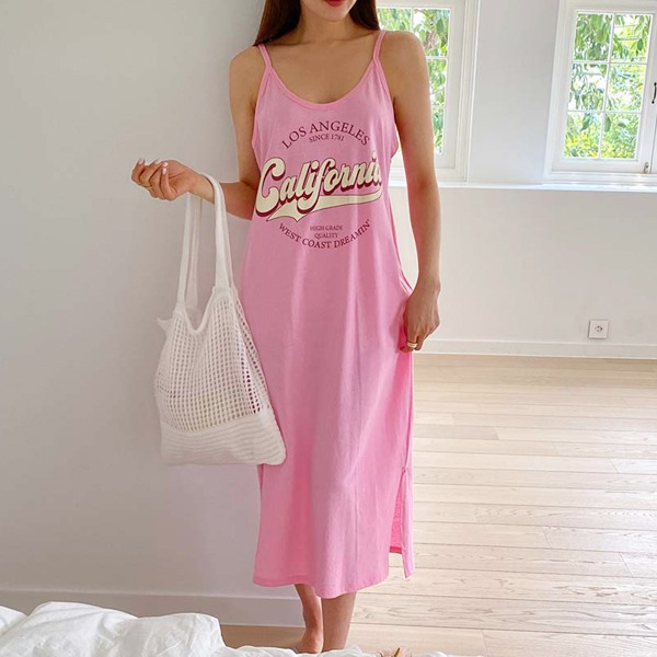 캘리포니아 나시원피스)나시끈원피스/민소매원피스/영문나염/끈나시롱원피스/홈웨어/이지웨어/영문레터링/롱나시원피스/루즈핏