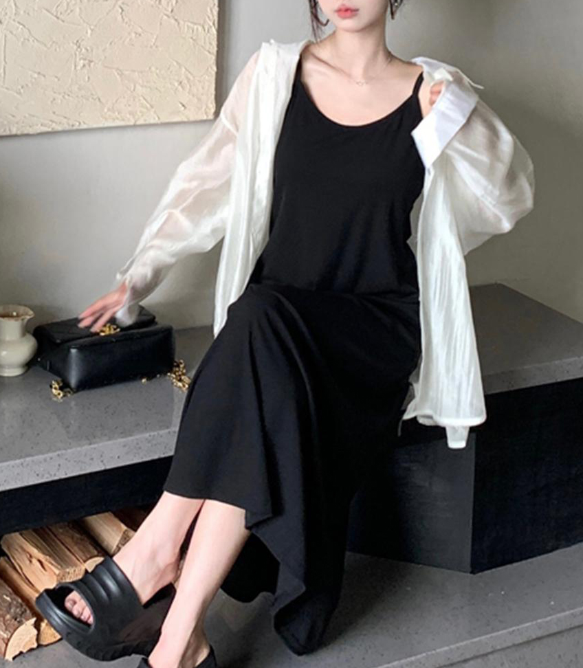 데일리 화이트 여름 셔츠/블랙 슬립 롱 원피스 코디세트