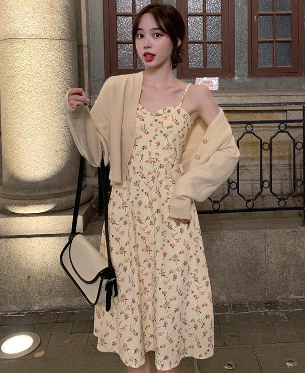 진주 단추 니트 가디건/꽃무늬 나시 롱 원피스 코디세트