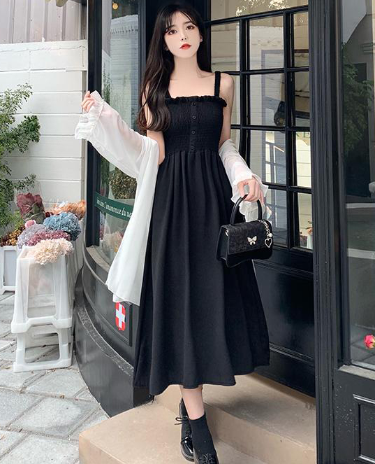 쉬폰 시스루 가디건/블랙 롱 나시 원피스 코디세트