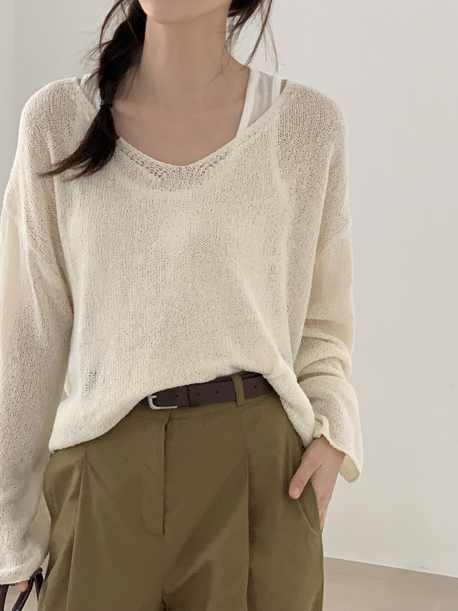 [당일배송] 마헨 린넨 하찌 그물 시스루 오버핏 브이넥 니트 3color