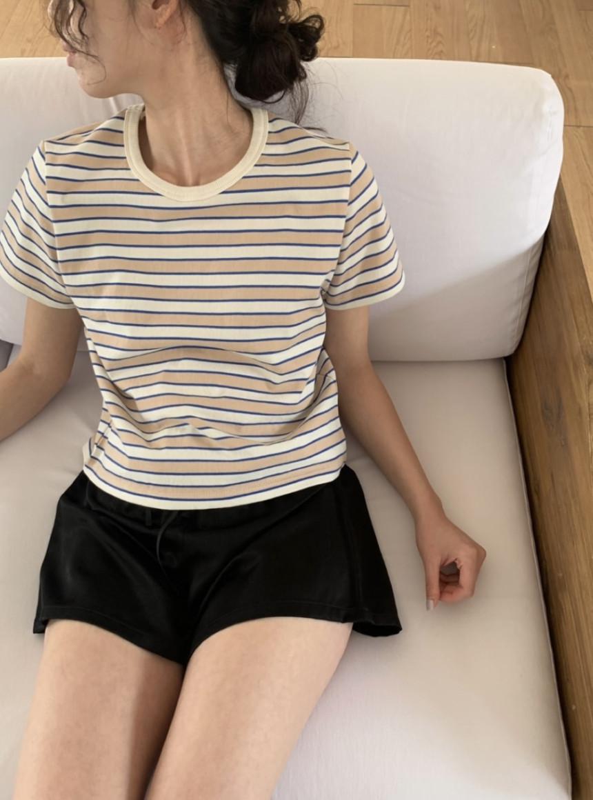 [de ondo] 드온도 멀티 스트라이프 반팔 티셔츠 단가라 배색 반팔티 (3color)와인당일