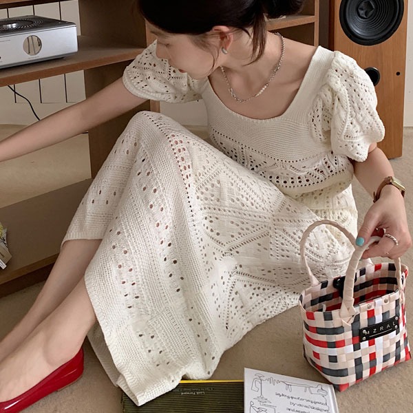 리오더(당일출고)-크로셰 펀칭 니트 올리 원피스