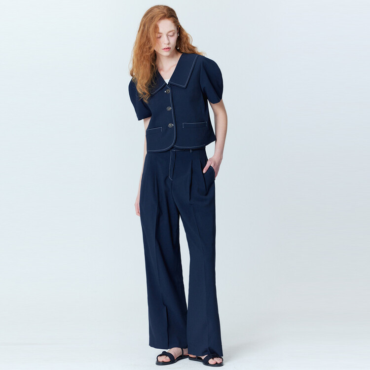 Puff sleeve cropped jacket_two-tuck wide pants set_Navy
