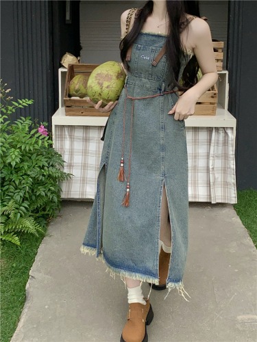 [~4XL] 빅사이즈 복고 Y2k 여름 데님 나시 원피스 옆트임 롱 스커트