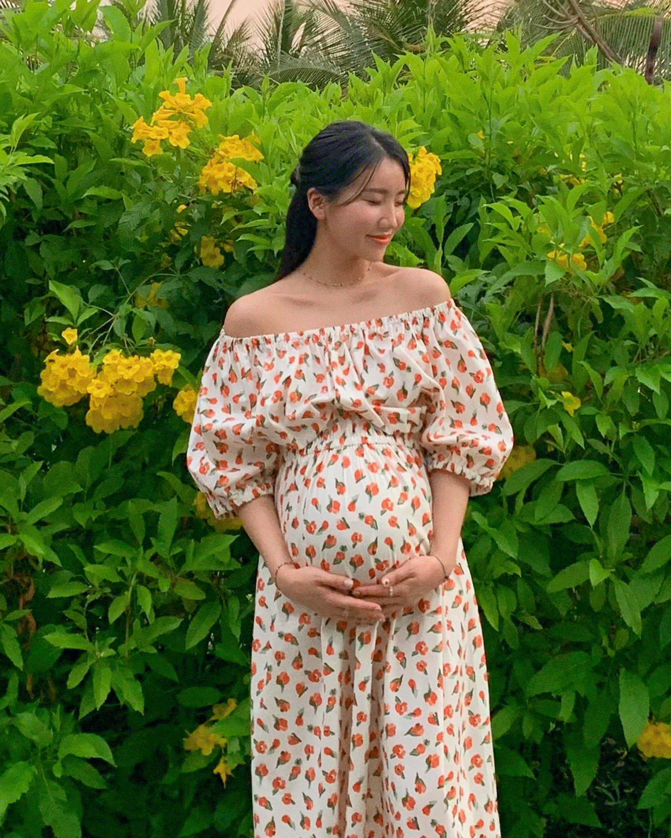 트로피칼 나염 임산부원피스 오프숄더 허리밴딩 태교여행 휴양지 만삭 임부복
