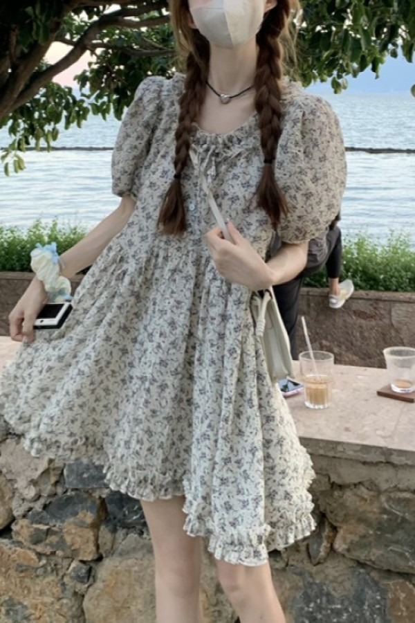 루아 플라워 러블릴 프릴 버블 반팔 A라인 미니원피스