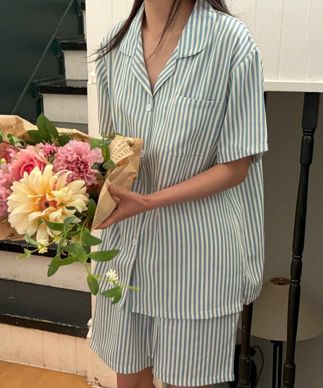 [무료배송] 레니 스트라이프 반팔 여름 커플잠옷 신혼부부 파자마 세트