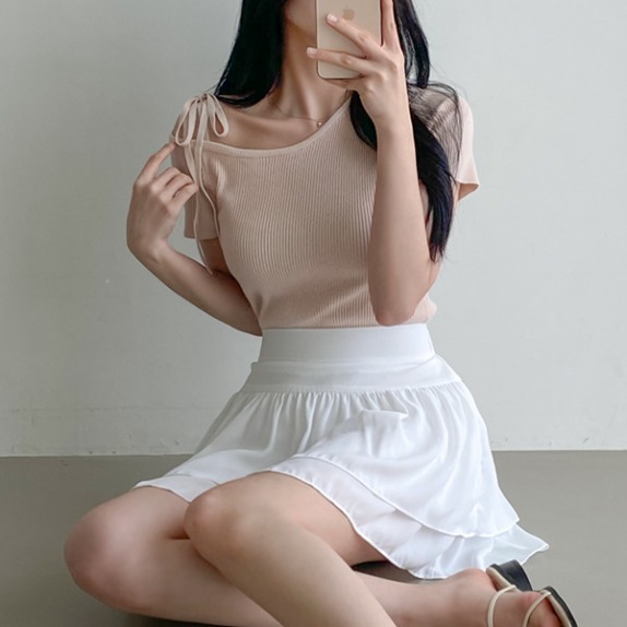 [당고언니클리어런스세일] 러츄언발리본반팔니트(5c) 파스텔니트 여름니트 원숄더 오프숄더 어깨리본 숄더리본 골지 슬림핏